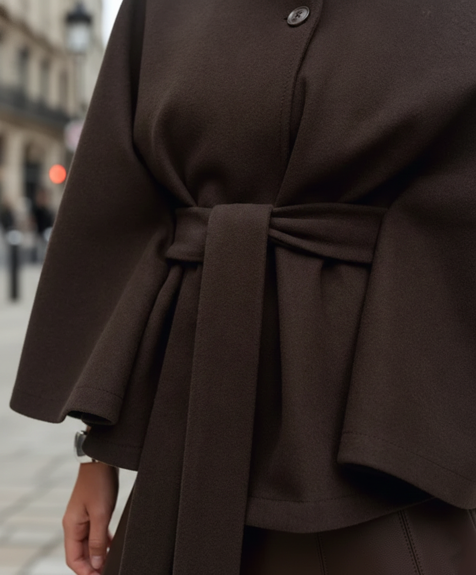 Grâce à sa coupe ample avec manches chauve-souris, ce manteau offre une liberté de mouvement optimale tout en mettant la silhouette en valeur grâce à sa ceinture ajustable.